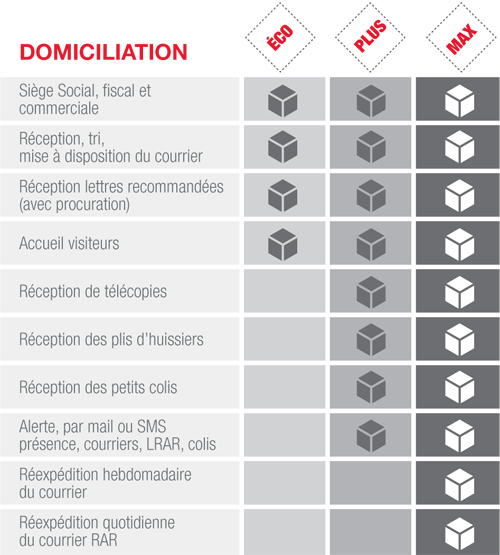 La domiciliation est la solution idéale pour tout type d'entreprise qui souhaite être présente sur un dépar- tement ou une région sans infrastructure immobilière. Avec la domiciliation, vous devenez titulaire d'un siège social légal non limité dans le temps et d'une adresse administrative utilisable sur l'ensemble de vos documents commerciaux (*)